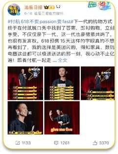 618 大促期间,美团闪购联合脱口秀艺人付航,以“30 分钟好货到手“为核心卖点,打造“快节奏消费”主题内容。通过脱口秀短视频、官宣海报、小红书 KOC+素人种草、微博抖音 KOL 扩散,形成闭环链路,为直播蓄水并强化品牌心智。