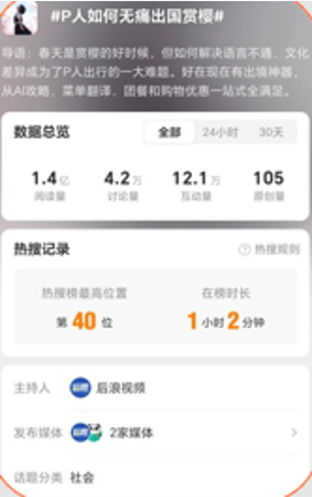 • 微博话题 #P 人如何无痛出国赏樱 阅读量超 1.4 亿,互动量 12.1 万 +,登上微博热搜第 40 位,在榜 1 小时;
