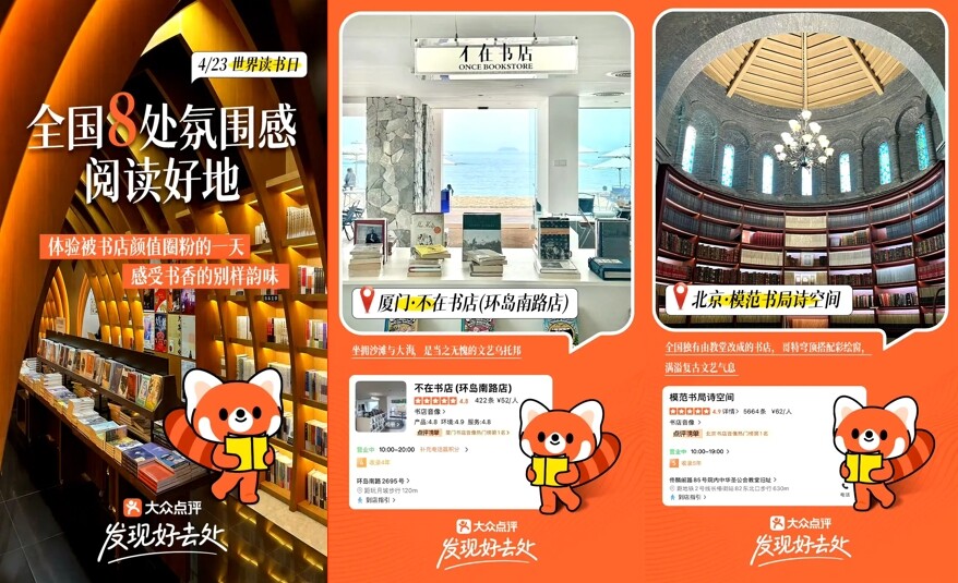 大众点评以 “发现好去处” 为品牌心智,借 423 世界读书日,围绕 “上大众点评发现读书好去处” 开展微博营销,联合站内小众有趣的优质图书馆 POI,强化平台 “发现感” 。
