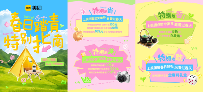 美团围绕春季踏青场景,用“上美团搜索踏青季”作为统一利益点,通过小红书、抖音、视频号三大平台联动 16 位达人线下打卡+线上种草,配合攻略海报、病毒表情包等多元物料,辐射多圈层用户,强化“过节上美团”的心智。
