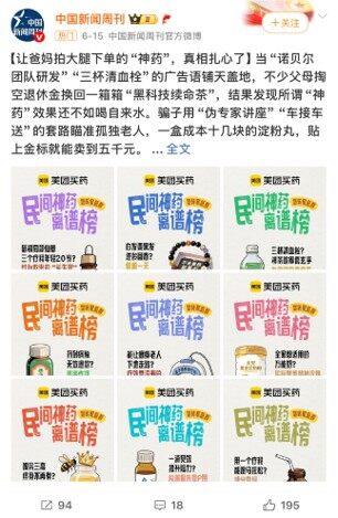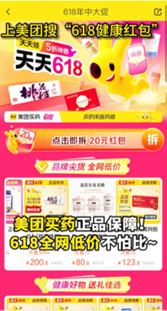 618 大促期间,美团买药以“保健品反诈”为核心议题,在微博、小红书双平台联动权威媒体、医生/科普博主及搞笑达人,用“离谱神药榜”海报、话题挑战与真实故事,向年轻人科普保健品套路,强化“美团自营大药房=正品低价”心智,并导流站内完成购买。